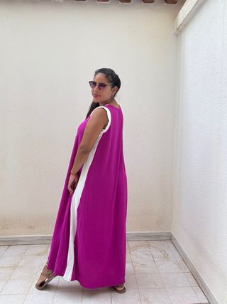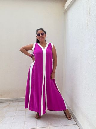 Precioso vestido largo de color morado con detalles blancos. Es amplio y fluido, ideal para el verano. - Diseño elegante y favorecedor. - Confección de calidad. - Perfecto para cualquier ocasión.