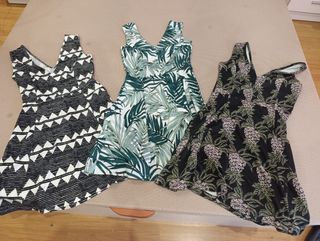 Tres vestidos veraniegos de diferentes estampados. Son ideales para cualquier ocasión. - Estampados: geométrico, tropical y piña. - Sin mangas. - Corte acampanado. 15€los 3