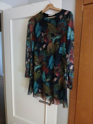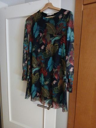 Precioso vestido de manga larga con un estampado de hojas multicolor sobre fondo negro. Es ligero y transparente, ideal para primavera u otoño. - Vestido de tejido ligero y fluido. - Estampado de hojas tropicales en tonos verdes, azules y rojos. - Manga larga con puños elásticos. - Corte a la altura de la rodilla.