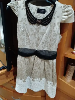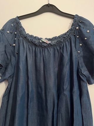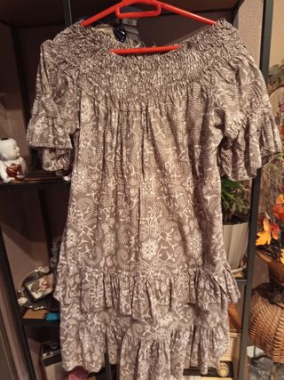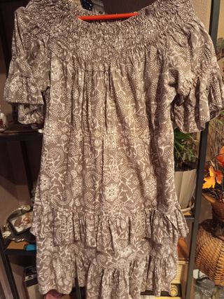 Vestido de estilo campesino con detalle de perlas.Esta en perfecto estado - Escote elástico. - Mangas cortas abullonadas. - Adornado con perlas en los hombros -Tela fina
