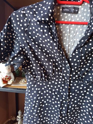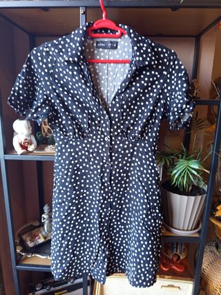 Vestido corto con estampado de lunares blancos sobre fondo negro. Presenta cuello camisero y cierre de botones. - Manga corta. - Cintura marcada.