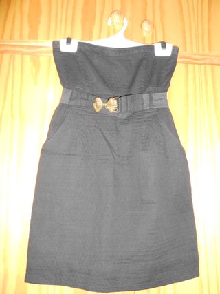 Vestido negro palabra de honor, con hebilla en forma de lazo en la cintura. Marca Stradivarius, Talla S. Como nuevo, Perfecto para el invierno, queda muy bien con botas altas.