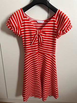 Vestido de rayas color coral y blancas con un diseño coqueto. En buen estado. - Escote en pico con lazada. - Mangas cortas abullonadas. - Corte evasé.