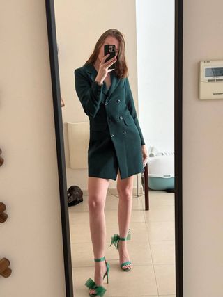Elegante vestido estilo blazer en color verde. - Diseño cruzado con doble abotonadura. - Corte mini. - Mangas largas.