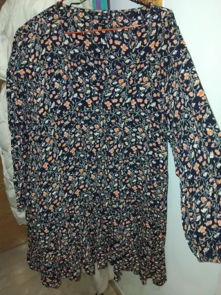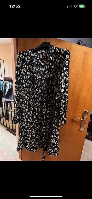Vestido camisero con estampado floral y manga larga. - Cierre de botones en la parte frontal. - Incluye cinturón para ajustar la cintura. - Bolsillos en ambos lados - Tejido fluido - Largo 108 cm - Hombro a hombro 42 cm