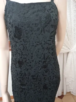 Elegante vestido negro con un delicado bordado floral en hilo bordado amano muy elegante lo presento con este mantón de una elegancia el mantón no entra con el vestido. - Diseño con tirantes finos. - Adornado con flecos largos en el bajo y en el chal. - El bordado es un detalle artesanal que recorre el chal y parte del vestido.