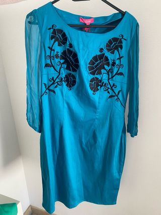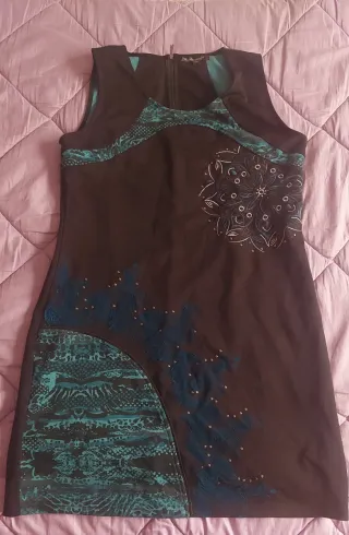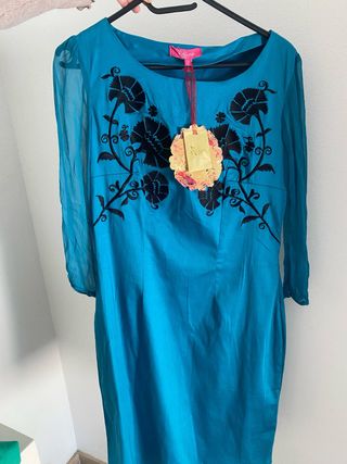 Vestido con un diseño único y llamativo. - Detalles en tejido turquesa con estampado. - Adornos de pedrería y bordado floral. - Corte sin mangas.