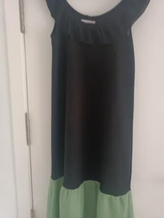 Vestido de verano con un diseño moderno y fresco. - Parte superior en color negro. - Falda con volante en color verde. - Diseño de tirantes finos.