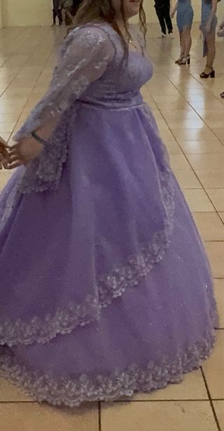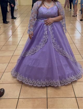 Vestido de ensueño para tu fiesta de 15 años. Un diseño espectacular que te hará sentir como una princesa. - Cuerpo con escote corazón y mangas largas de encaje. - Falda voluminosa con detalles brillantes. - Adorno de encaje en el bajo y en la capa. - Incluye un bolero o capa a juego.