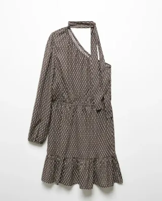 Vestido asimétrico de Mango con un estampado geométrico en tonos beige y marrón. Presenta un diseño moderno y favorecedor. - Diseño asimétrico. - Estampado geométrico. - Cintura elástica. - Volante en el bajo.