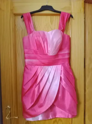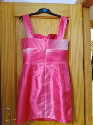 Vestido de fiesta en tono rosa, con un diseño elegante y detalles fruncidos en la cintura. - Tirantes anchos. - Cremallera en la espalda. - Tejido satinado con brillo.