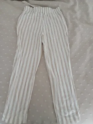 Pantalón de vestir con un diseño de rayas verticales. - Cintura elástica con lazada. - Cierre con botones de madera. - Bolsillos laterales.