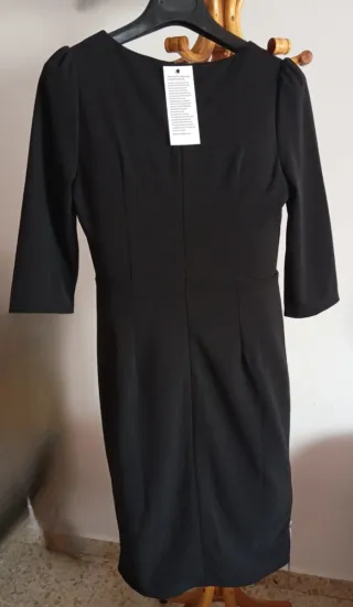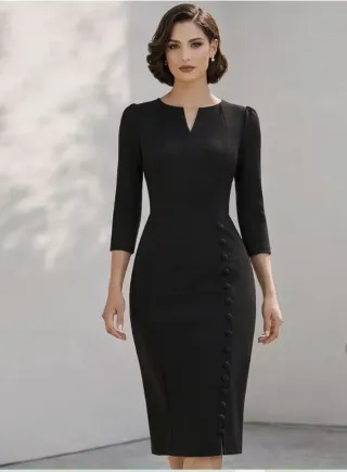 Vestido negro de corte entallado, ideal para mantilla, eventos, ceremonia, cóctel o cenas. Presenta un diseño sofisticado con detalles que realzan la figura. - Escote en V. - Mangas tres cuartos. - Botones decorativos en la parte frontal. Lo compre durante las rebajas, y se me paso la fecha de límite de devolución