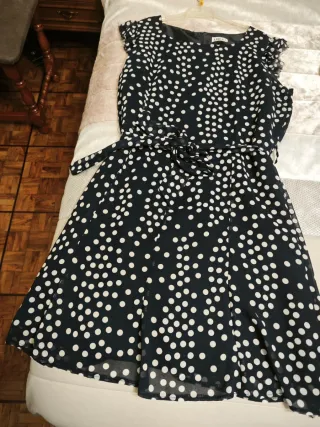 Vestido fresco con estampado de lunares blancos sobre fondo negro. Ideal para días cálidos. - Diseño con cinturón anudado. - Mangas cortas con volantes. - Falda con vuelo.
