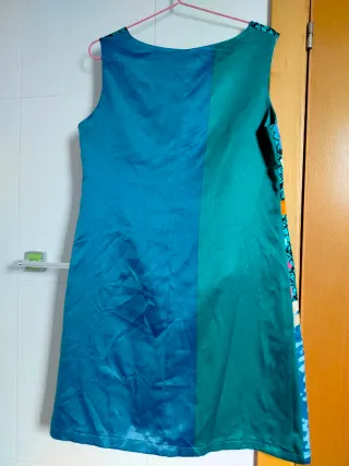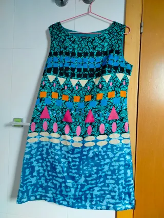Vestido de la marca Rebeldes con un diseño vibrante y moderno. - Estampado geométrico y abstracto en tonos azules y turquesas. - Detalles en negro, blanco, naranja, rosa y beige. - Corte recto y sin mangas. Precio 3.50 euros no negociables ◾ No acepto ofertas ◾ Solo venta por envios ◾ Envio en menos de 24 horas después de su compra.