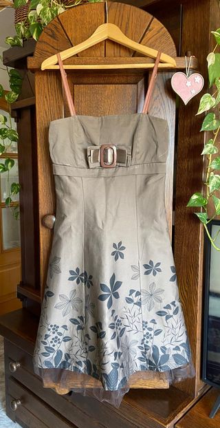 Pecho entallado y con refuerzo para darle mayor firmeza, con tirantes que pueden esconderse para que quede un escote palabra de honor. La falda con vuelo, con realce, porque debajo lleva un tul que hace efecto cancán. Cremallera invisible, cinturón en el pecho de adorno. La tela es brillante gracias a la viscosa. Color marrón y flores negras. Talla S según fabricante, no obstante yo mido toda la ropa que vendo, así es que aconsejo ver fotos con medidas reales. Uso solo una vez, está impecable. 95% algodón 5% viscosa Limpio No lo regalo, si te gusta es tuyo por solo 12 euros. Ver la foto de mi perfil para más información