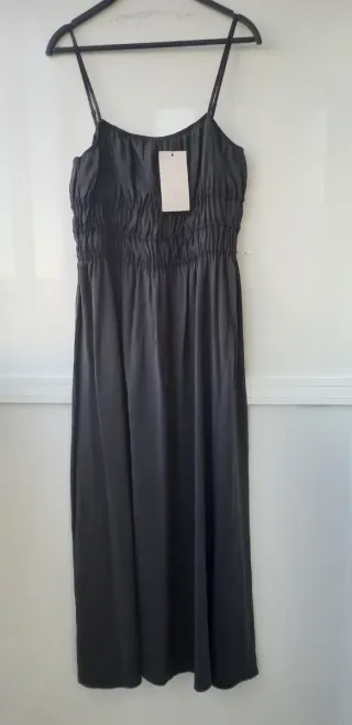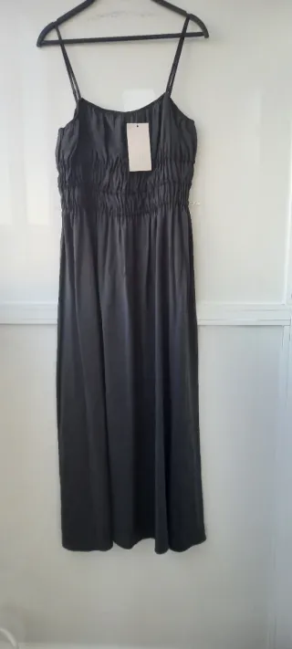 Vestido largo de Zara con tirantes finos ajustables y escote recto elástico. Detalle de tejido drapeado en pecho con elásticos. - Tejido ligero y fluido.