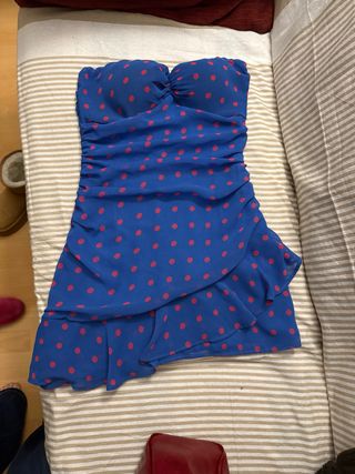 Vestido de Zara con un diseño vibrante y juvenil. - Estampado de lunares en azul y rosa - Diseño fruncido en el cuerpo. - Volantes en la falda.