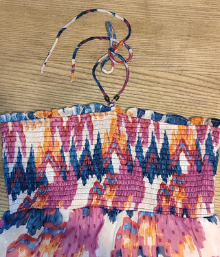 Vestido largo de verano con un estampado vibrante y llamativo. Perfecto para días soleados. - Diseño sin tirantes con escote fruncido. - Tejido ligero y fluido. - Estampado geométrico y abstracto en múltiples colores.