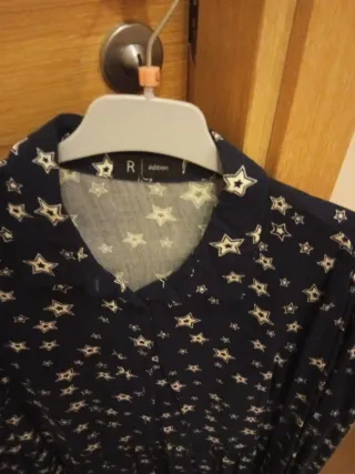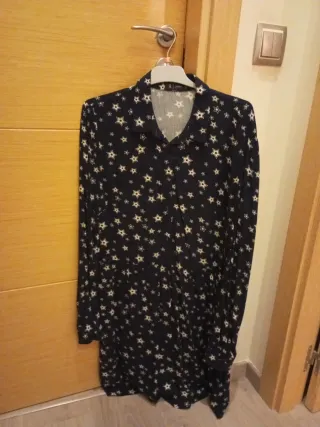 Vestido con un estampado de estrellas. - Diseño de manga larga. - Cuello camisero. Tacto agradable Largo por debajo de la rodilla Talla 40-42 porque es holgado Lleva cremallera oculta en el lateral para comodidad al vestirse