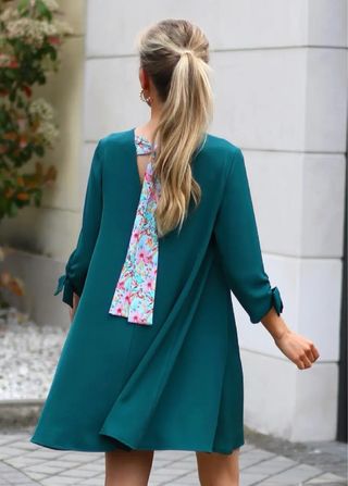 Vestido de la marca An&Be, diseñado y confeccionado en Madrid (España), modelo Icon, en color verde, talla S. Puesto en una única ocasión, una boda. Detalle de lazada con estampado floral en la espalda. Lo enseño en Madrid y también hago envíos. Precio en tienda: 99 euros. Precio no negociable.