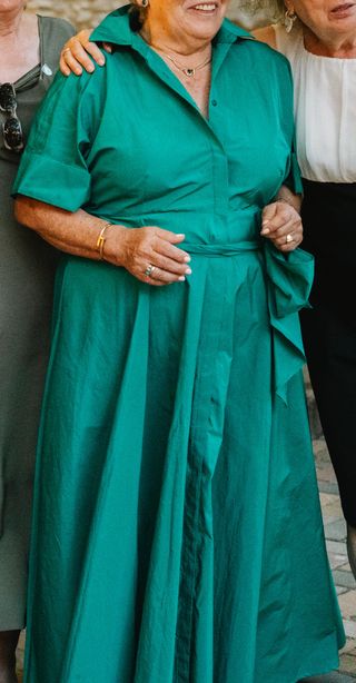 Elegante vestido largo verde de la marca El Corte Inglés. Diseño camisero con cinturón, manga corta y falda amplia. Tela armada que favorece la figura. Usado solo un día en boda, en perfecto estado, sin desperfectos y totalmente limpio.