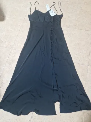 Elegante vestido largo de tirantes finos y escote pronunciado. Su diseño presenta una hilera de botones en la parte frontal y una abertura lateral que le da un toque sofisticado. - Tirantes finos ajustables. - Escote en V. - Cierre de botones en la parte delantera. - Abertura lateral en la falda.
