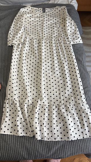 Vestido largo con estampado de lunares. - Diseño de manga corta. - Falda con volantes en el bajo. - Cuello redondo.