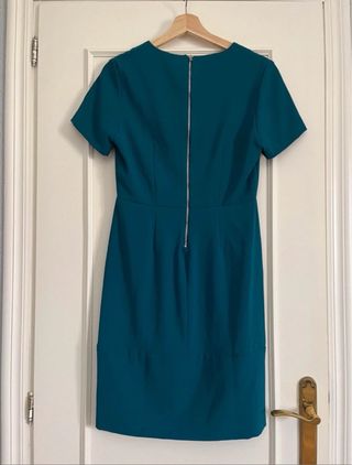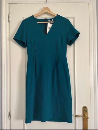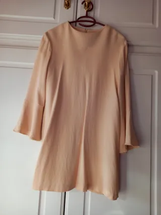 Vestido de dama de honor o invitada de boda de longitud hasta la rodilla. - Diseño con escote en V. - Mangas largas abullonadas. - Tejido brillante con textura. - Falda con vuelo y detalle de volantes. Vendo con etiqueta. No me cabe y se me ha pasado el tiempo de devolución