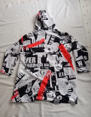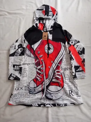 Vestido sudadera con un diseño llamativo y moderno. - Estampado frontal de zapatillas. - Capucha con cordones. - Mangas largas. Nuevo con etiqueta.