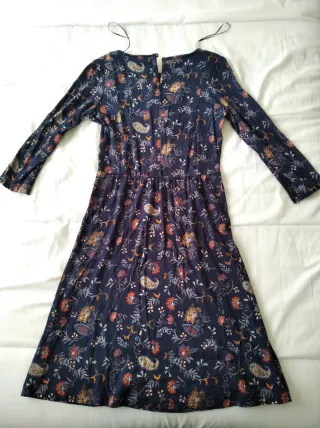 Vestido con mangas de murciélago, cintura elástica y falda con vuelo. Cerrado mediante botones en la espalda. Estampado en tonos rojos y blancos sobre fondo azul marino. Talla L que en esta marca equivale a una 44 española. Largo sin fruncir 104 cm. - Manga larga.