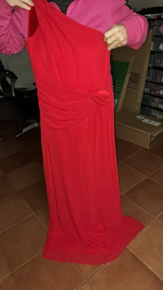 Elegante vestido largo de color rojo, ideal para eventos especiales. - Diseño de un solo hombro. - Detalle de flor en la cintura. - Tela con drapeado. - Corte asimétrico. Usado una vez. No se hacen envíos, entrega en mano, venir a recoger