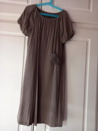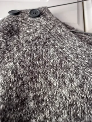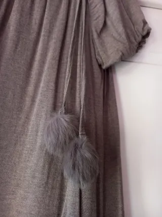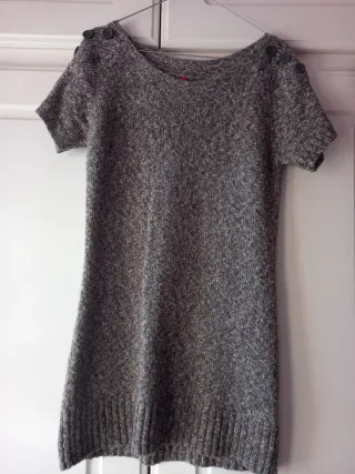 Vestido de punto gris con un diseño moderno y detalles que lo hacen especial. - Tejido de punto suave y cómodo. - Detalle de botones en los hombros. - Diseño de manga corta. - Largo hasta la rodilla.