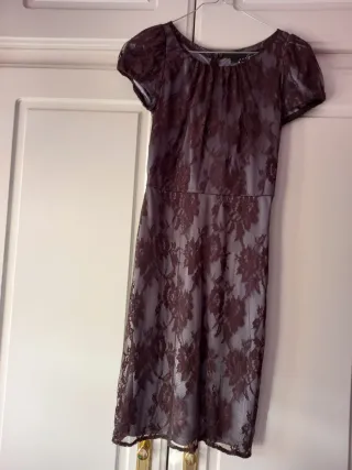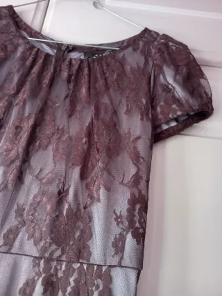 Elegante vestido ideal para ocasiones especiales. Va completamente forrado. Cierre mediante cremallera profunda en la espalda. Ancho de hombros 40 cm, pecho 55 cm, cintura 49 cm y largo 105 cm. Es una XL pero por sus medidas equivale a una 44-46 - Tejido de encaje con forro interior. - Corte que favorece la figura. - Manga corta. - Largo hasta la rodilla.