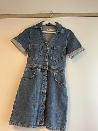 Vestido vaquero de manga corta con cuello camisero y botones. - Dos bolsillos en el pecho. - Cintura marcada. - Bolsillos laterales. - Largo hasta la rodilla.