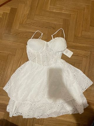 Vestido blanco corto con un diseño de vuelo. - Tejido con bordados. - Tirantes finos. - Falda con volantes.