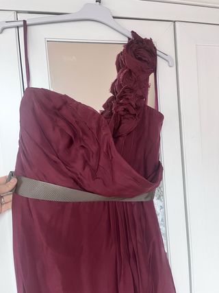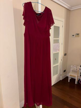 Vestido largo de color granate, ideal para invitadas de boda y ocasiones especiales. Talla 0XL - Diseño con escote en V. - Cinturón a juego. - Mangas acampanadas. Una puesta