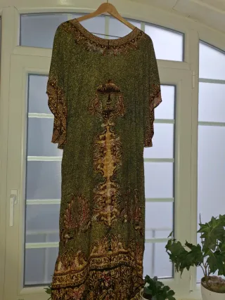 Vestido largo de estilo étnico con un corte fluido y ancho. - Diseño estampado multicolor sobre fondo verde. - Cuello redondo con detalle de borde. - Mangas amplias y caídas.