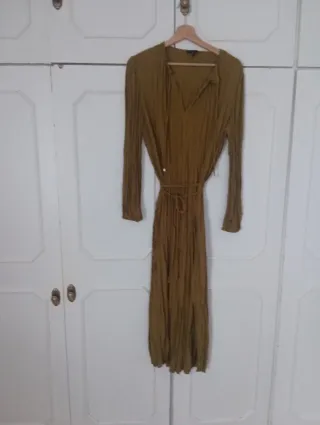 Vestido largo de Massimo Dutti con manga larga. - Diseño con cuello en V y lazada. - Cintura ceñida con cordón. - Falda con caída y movimiento. - Tiene una lavada estupenda y no necesita plancha. - Se puede llevar suelto,también puedes llevar un chaleco encima o un jersey. - Puedes llevarlo tanto de día como de noche e incluso en una boda. Está impecable.