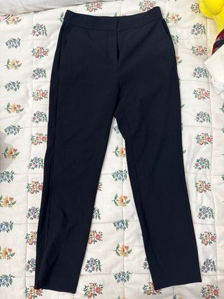 Pantalones de vestir de corte clásico con un discreto estampado de rayas verticales. - Diseño elegante y versátil. - Cintura con trabillas y cierre de cremallera y botón.