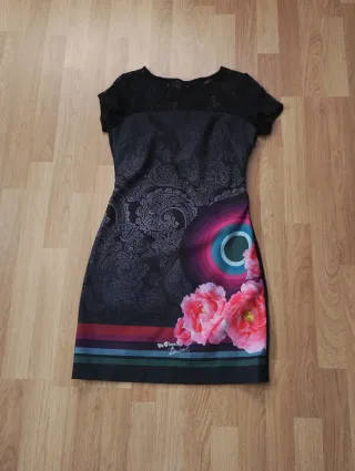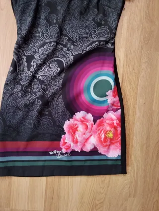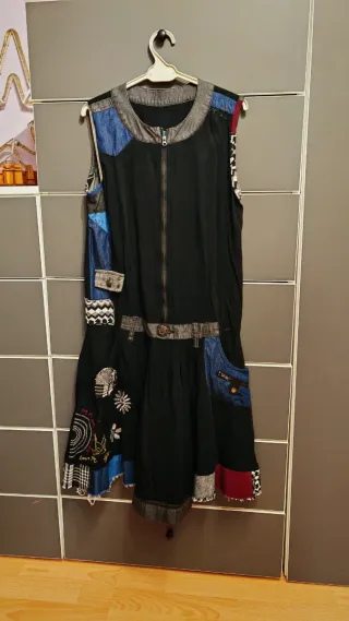 Vestido de diseño llamativo y muy original. - Estampado paisley en tonos oscuros. - Detalle de flores y círculos de colores vivos - Parte superior de encaje negro. - Bajo con franjas de colores. Cremallera en la parte trasera. Talla 38. Practicamente NUEVO. Usado solo dos o tres veces. En perfecto estado.