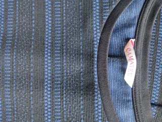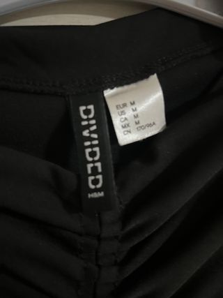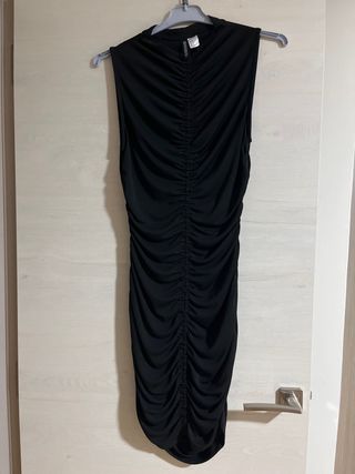 Vestido negro con un diseño fruncido que crea un efecto drapeado muy favorecedor. - Tejido ligero y elástico. - Sin mangas. - Largo hasta la rodilla.