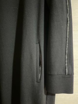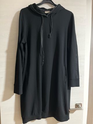 Vestido con capucha de corte moderno y cómodo. - Diseño con cordones ajustables en la capucha. - Bolsillos laterales. - Detalle de tira lateral en las mangas. - Puños y bajo elásticos.