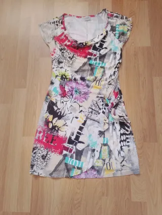 Vestido de verano con un estampado vibrante y llamativo. - Diseño con cuello drapeado. - Detalle de nudo lateral. - Manga corta. - Largo hasta la rodilla.