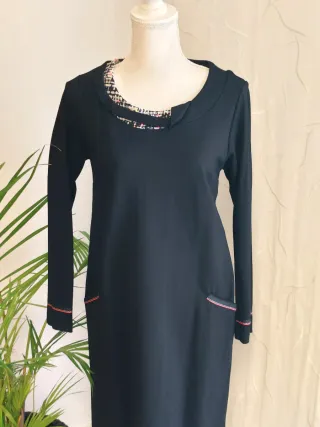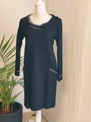 Vestido de invierno con forro interior. Presenta un detalle de tejido multicolor en el cuello y en los bolsillos. - Cuello redondo con detalle de tweed. - Bolsillos frontales con ribete de color. - Manga larga.