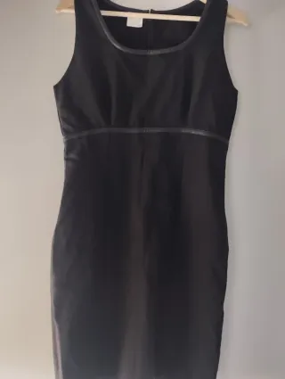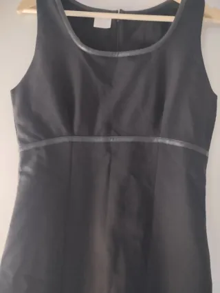 Vestido negro de corte entallado, con un diseño elegante y sofisticado. Presenta detalles que realzan su estilo. - Escote redondo. - Ribete en escote y cintura. - Sin mangas. - Largo hasta la rodilla.