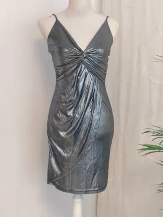 Vestido plateado con un diseño elegante y moderno. - Tejido brillante con textura. - Escote cruzado. - Drapeado en la falda. - Tirantes finos.