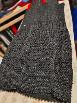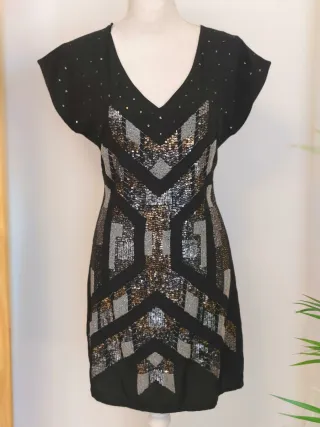 Elegante vestido negro con un diseño llamativo de lentejuelas y canutillo. - Dibujo geométrico en lentejuelas doradas y plateadas. - Detalle de canutillo plateado. - Escote en pico. - Mangas cortas tipo mariposa. Se hacen envíos 0 se recoge en manresa