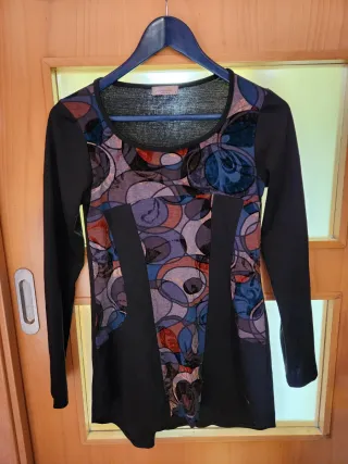 Vestido de manga larga con un diseño llamativo y moderno. - Mangas y parte inferior en negro liso. - Panel frontal con estampado geométrico y floral. - Cuello redondo. - Ideal para combinar con leggins o pantalón ajustado