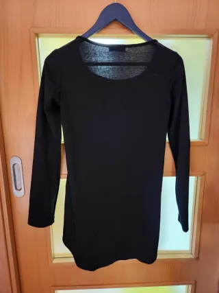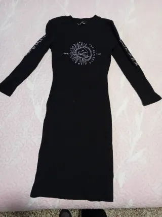 Vestido negro de Bershka con manga larga y un diseño estampado en el pecho. - Estampado frontal con motivos celestes. - Diseño ajustado. - Mangas largas con detalles. - Largo hasta la rodilla.